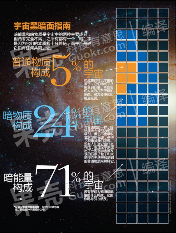 宇宙的3种主要构成成分,暗能量所占比例超过70%。图片来源:《发现》杂志
