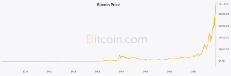 比特币是 2009 年一个自称叫中本聪(Satoshi Nakamoto)的人发明的,发行前几年一直不温不火,只在小范围内流通,今年 5 月份开始爆发性增长。根据比特币交易网站 Bitcoin.com的统计,今年 1月份比特币的价格是每枚 1007 美元,今天已经涨到了 9922 美元,涨了接近 10 倍。