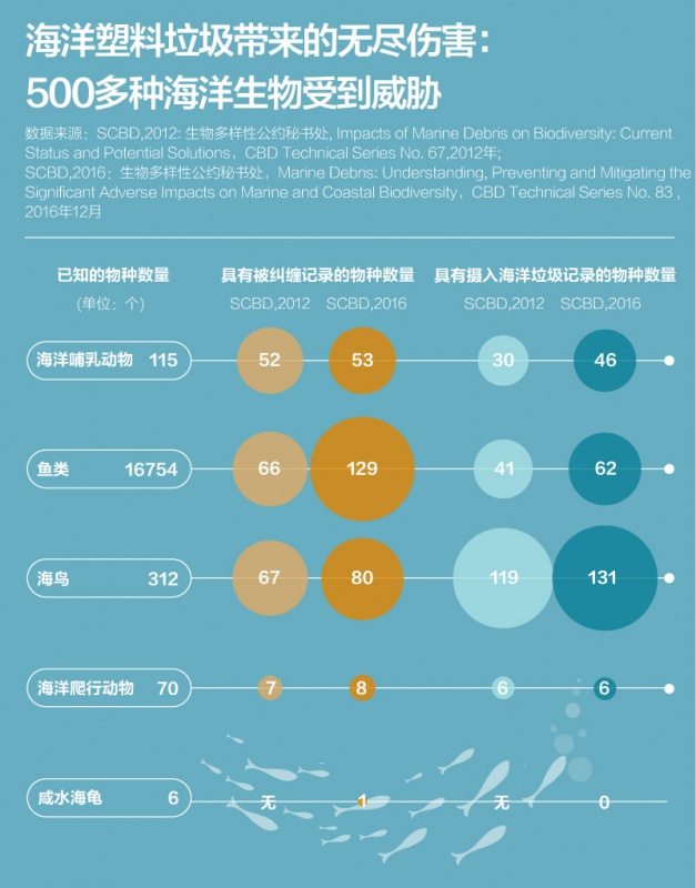 根据联合国《生物多样性公约》秘书处2016年发布的报告显示,自2012年以来,全球受到海洋垃圾影响的海洋生物种群数量已从663种增加到817种;其中有519种物种发现受到塑料垃圾缠绕或吸入体内影响,约40%的鲸类动物和44%的海鸟类物种的体内发现了微塑料的存在。